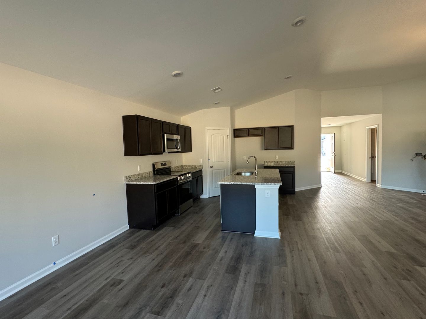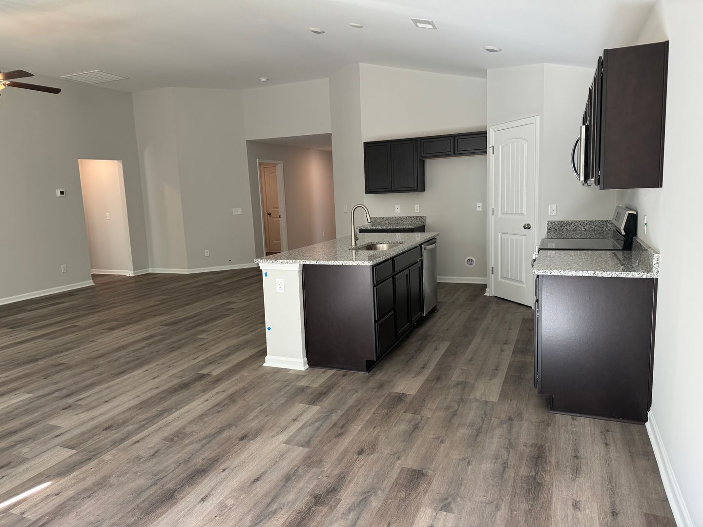High ceilings in the living area as well as beautiful granite countertops and stainless steel appliances in the kitchen.